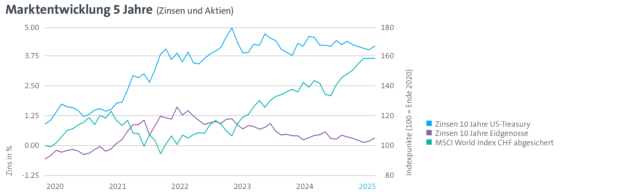 Dieses Marktumfeld führte zu einer insgesamt flachen Kursentwicklung bei Schweizer Anleihen, während globale Anleihen in Lokalwährung positive Renditen erzielten. Die Bonitätsaufschläge für Unternehmensanleihen entwickelten sich seitwärts. Die Aktienmärkte verzeichneten weltweit und über alle Regionen hinweg breite Kursgewinne. Entscheidend war der Umgang mit der USD‑Währungsabsicherung: Der globale Aktienindex erzielte mit Absicherung gegenüber dem Schweizer Franken eine Rendite von rund +14% (siehe grüne Linie in der Grafik), während sie ohne Absicherung lediglich etwa +6% betrug.
