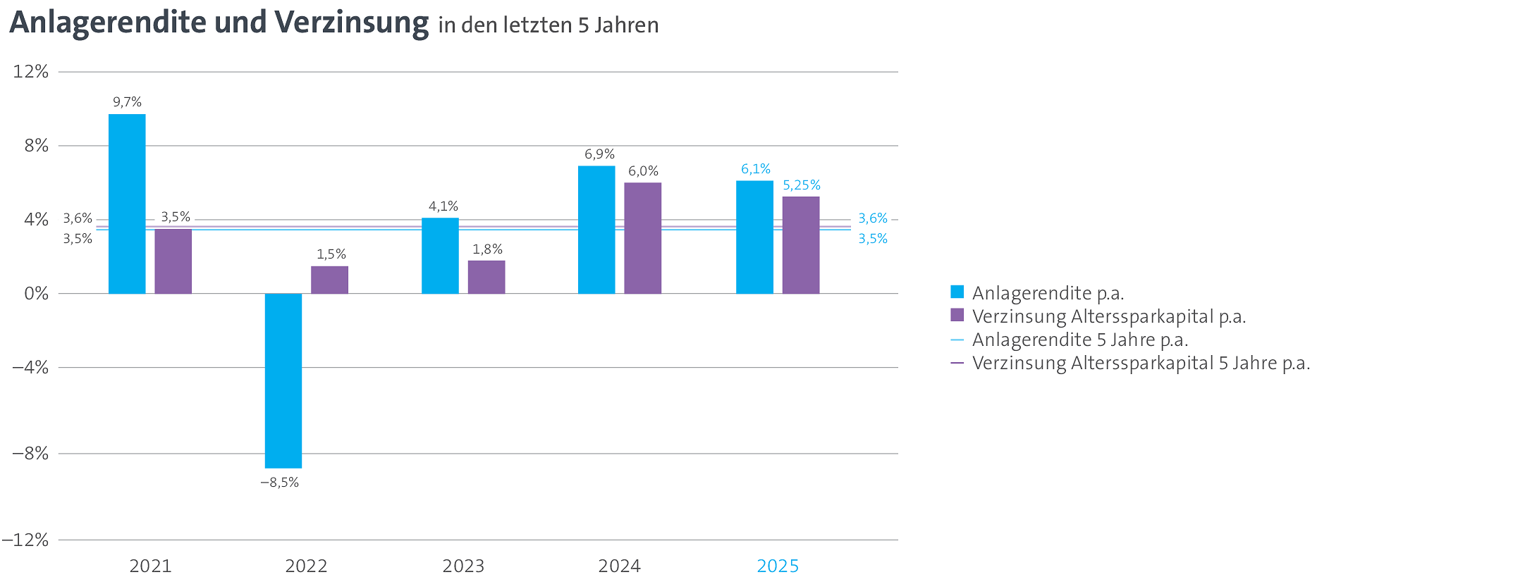 Im Geschäftsjahr 2025 betrug die Anlagerendite +6,1%. In den letzten fünf Jahren wurde eine durchschnittliche jährliche Rendite von +3,5% erzielt (siehe Grafik für detaillierte Performancezahlen). Damit wurde die Sollrendite für diese Zeitperiode übertroffen. Der über der Sollrendite liegende Renditeanteil diente dem Aufbau der Wertschwankungsreserve. Im Durchschnitt konnten die Altersguthaben der aktiven Versicherten in den letzten fünf Jahren mit 3,6% pro Jahr verzinst werden, was in etwa der erzielten Rendite entspricht. Das positive Anlageresultat im Jahr 2025 führte zu einer Erhöhung der Wertschwankungsreserve sowie des Deckungsgrads. Der Zieldeckungsgrad von 118,0%, der zur langfristigen Sicherstellung der versprochenen Vorsorgeleistungen angestrebt wird, wurde damit erreicht.