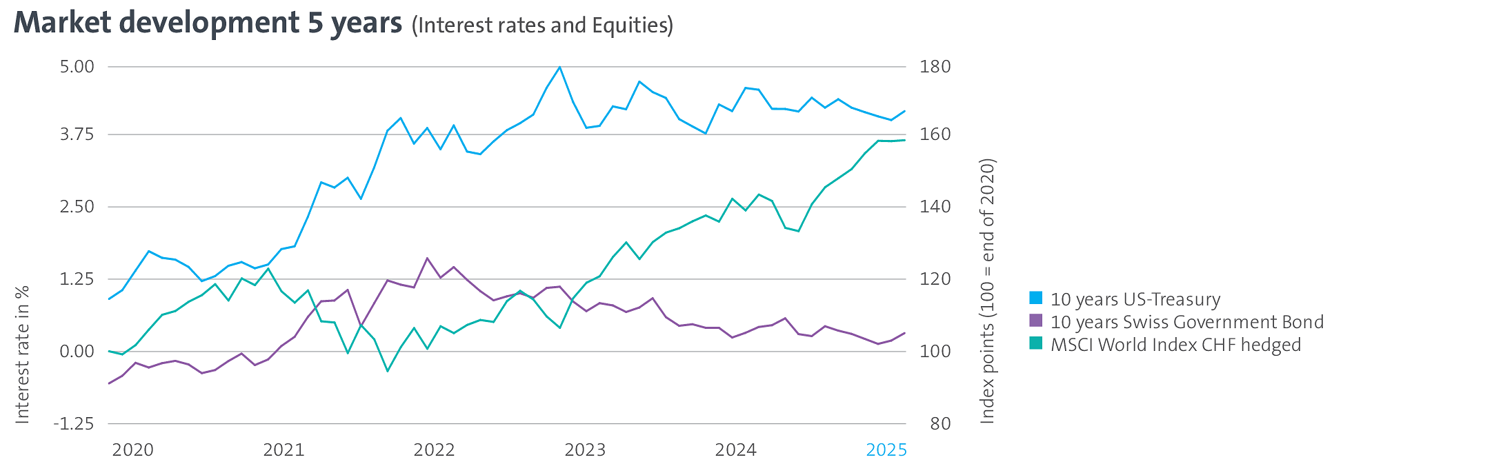 This market environment led to a generally flat price performance for Swiss bonds, while global bonds in local currency generated positive returns. Corporate Credit spreads remained largely unchanged. Broad equity markets recorded price gains worldwide and across all regions. A decisive element was the treatment of USD currency risk: the global equity index achieved a return of around +14% when hedged back to the Swiss franc (see green line in the chart) and around +6% without hedging.
