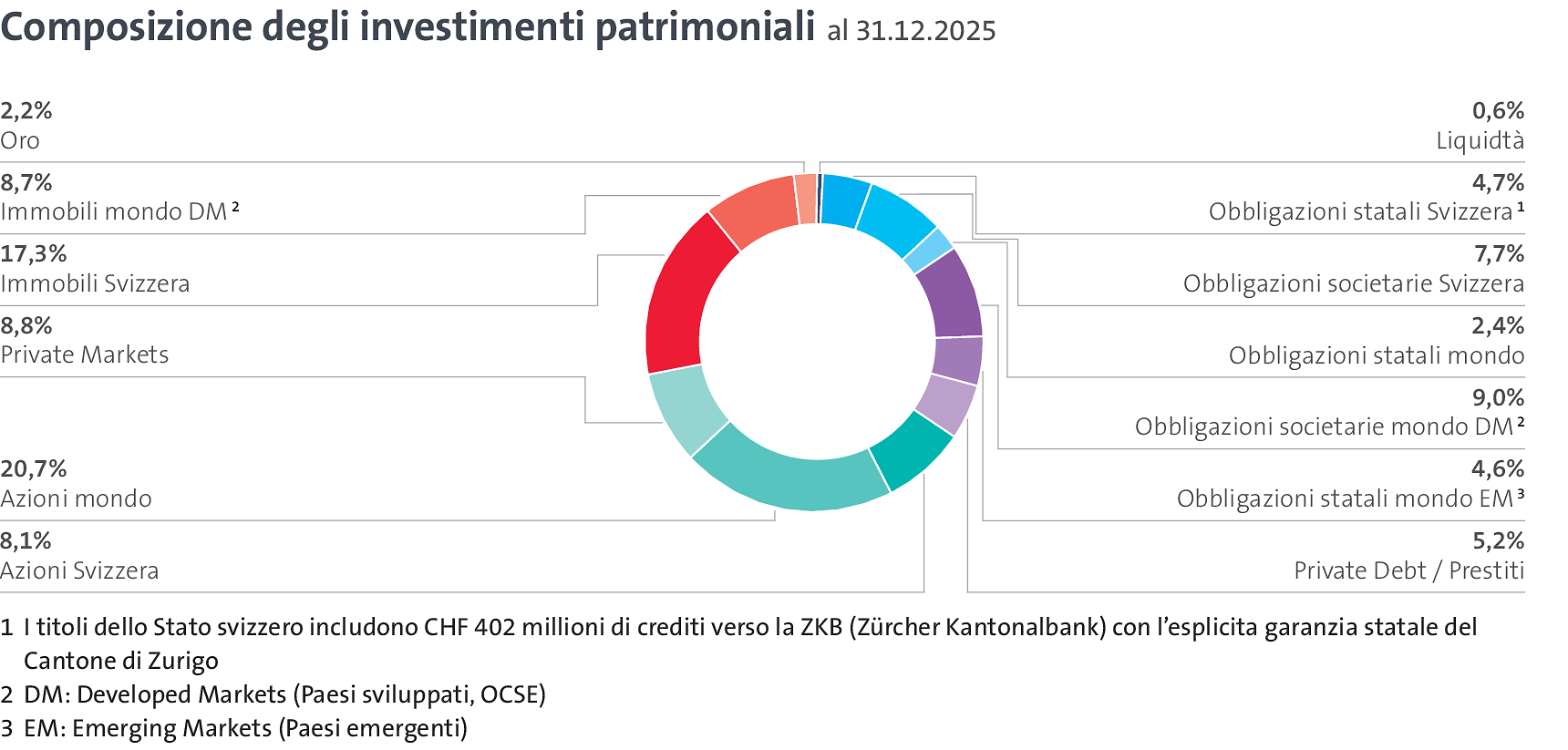 Sulla base della strategia d'investimento approvata dal consiglio di fondazione e delle fasce stabilite, al 31 dicembre 2025 comPlan ha investito il 34% del patrimonio in valori nominali, quali obbligazioni statali e societarie e crediti alle imprese. I valori nominali con elevata solvibilità e rendimenti corrispondentemente bassi sono considerati investimenti relativamente sicuri, poiché i casi di insolvenza sono rari. Essi costituiscono una componente stabilizzante della strategia complessiva, al fine di attenuare le fluttuazioni di valore tendenzialmente più elevate delle azioni (38%) e dei valori reali (28%). Le azioni e i valori reali sono necessari affinché comPlan possa ottenere nel lungo termine il rendimento necessario per finanziare le prestazioni previdenziali promesse.