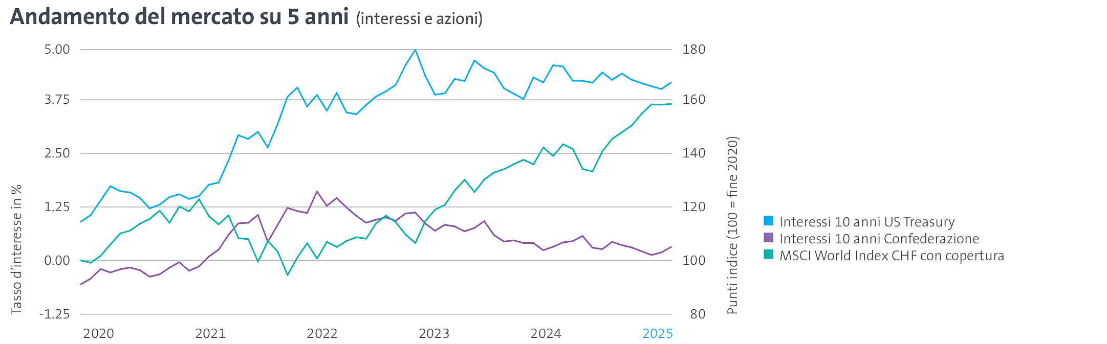 Questo contesto di mercato ha portato a un andamento complessivamente piatto dei prezzi delle obbligazioni svizzere, mentre le obbligazioni globali in valuta locale hanno registrato rendimenti positivi. I premi di credito per le obbligazioni societarie hanno registrato un andamento laterale. I mercati azionari hanno registrato ampi guadagni in tutto il mondo e in tutte le regioni. Determinante è stata la gestione della copertura valutaria in USD: l'indice azionario globale ha registrato un rendimento di circa il +14% con copertura rispetto al franco svizzero (vedi linea verde nel grafico), mentre senza copertura il rendimento è stato solo del +6% circa.