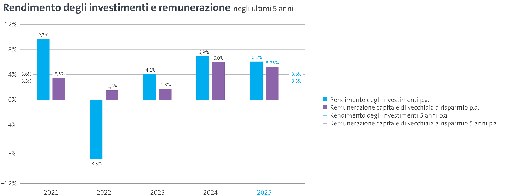 Nell'esercizio 2025 il rendimento degli investimenti è stato pari al +6,1%. Negli ultimi cinque anni è stato realizzato un rendimento medio annuo del +3,5% (vedere il grafico per i dati dettagliati sulla performance). È stato quindi superato il rendimento previsto per questo periodo. La quota di rendimento superiore al rendimento previsto è stata utilizzata per costituire la riserva di fluttuazione di valore. In media, negli ultimi cinque anni gli averi di vecchiaia degli assicurati attivi hanno fruttato un interesse del 3,6% all'anno, che corrisponde all'incirca al rendimento realizzato. Il risultato positivo degli investimenti nel 2025 ha portato ad un aumento della riserva di fluttuazione e del grado di copertura. È stato così raggiunto il grado di copertura obiettivo del 118,0%, auspicato per garantire a lungo termine le prestazioni previdenziali promesse.